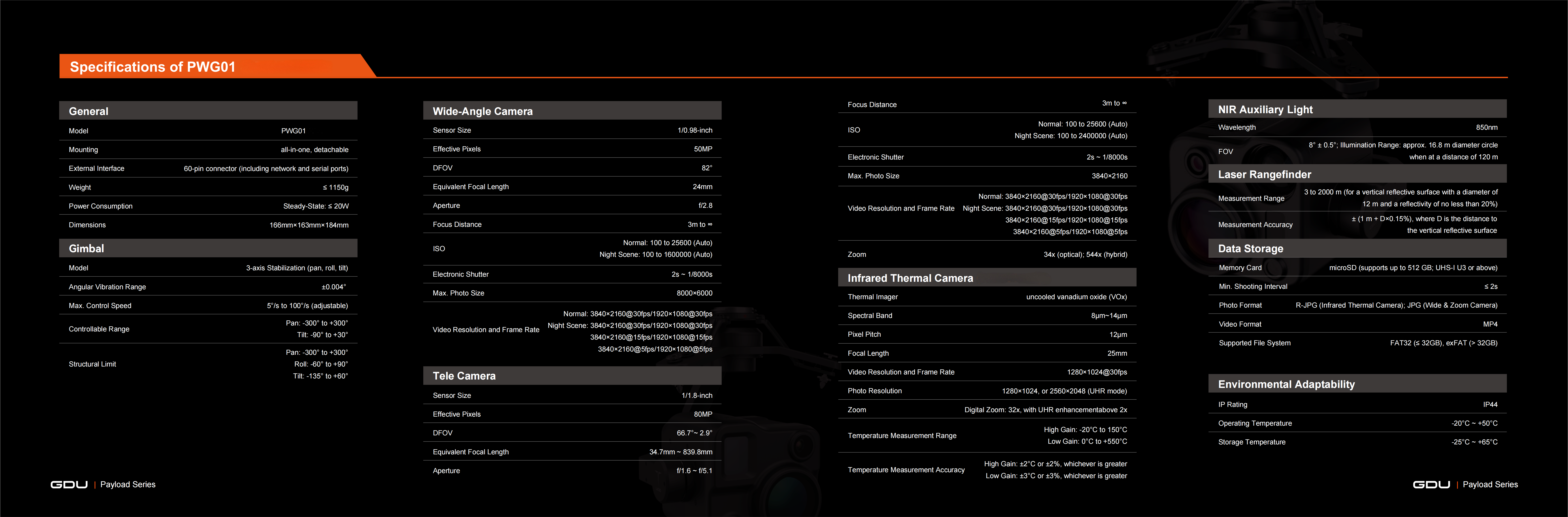 This solution integrates five advanced modules: a 1/0.98-inch wide camera, a 34x continuous optical zoom camera, a 1K infrared thermal imager (PWG01 only), a laser rangefinder, and a near-infrared (NIR) auxiliary light.