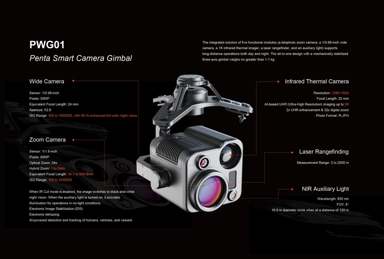 This solution integrates five advanced modules: a 1/0.98-inch wide camera, a 34x continuous optical zoom camera, a 1K infrared thermal imager, a laser rangefinder, and a near-infrared (NIR) auxiliary light. Powered by 10.4T of AI computing performance, it significantly enhances imaging and perception capabilities. This solution transcends spatial boundaries and overcomes the day-night vision limitations, making it well-suited for tasks in smart city management, public safety, energy inspection, water conservancy, and forestry operations.