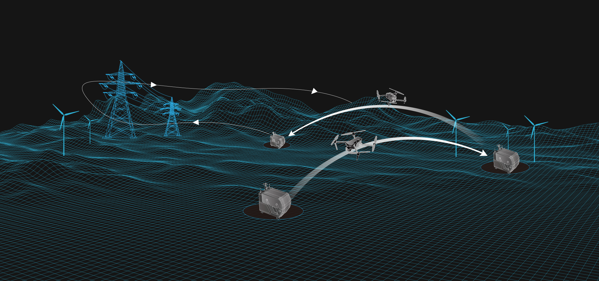 It supports relay operation between UAV A to Dock B, which effectively increases the inspection operation time and expands the operation scope; it uses self-organizing network relay communication to ensure uninterrupted connection during long-distance inspections in a network-free environment; Dock has a built-in weather information system to obtain weather conditions in real time and carry out mission planning.